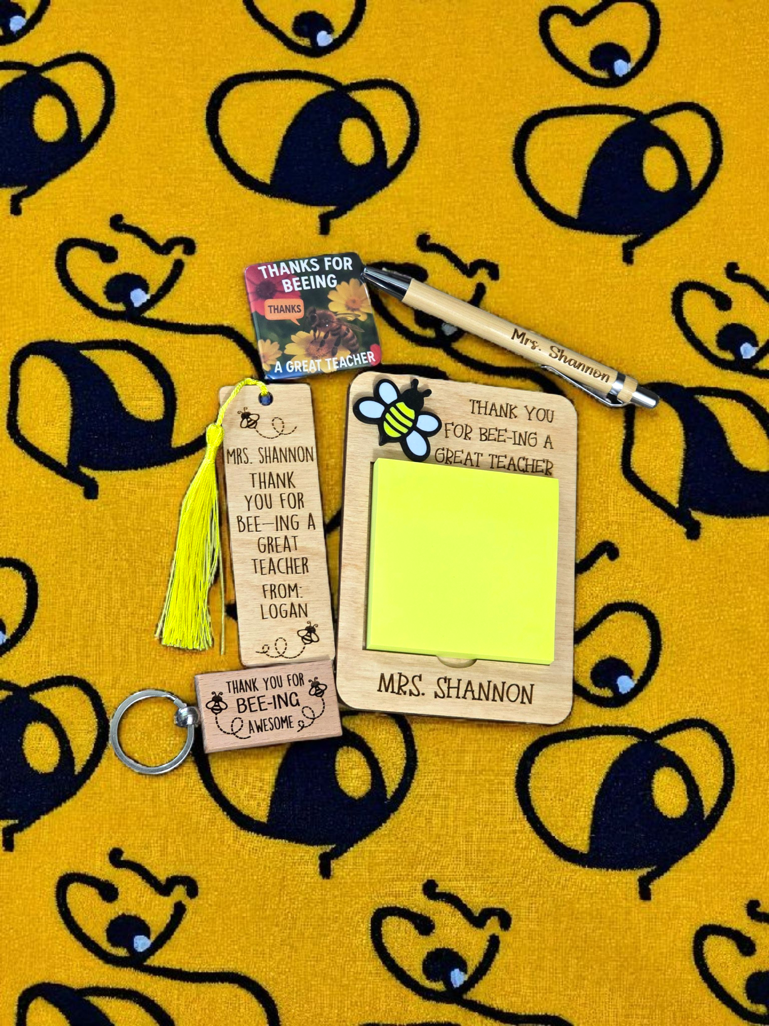 Sticky note holder(bee is 3D printed), magnet 2", pen, bookmark, keychain.