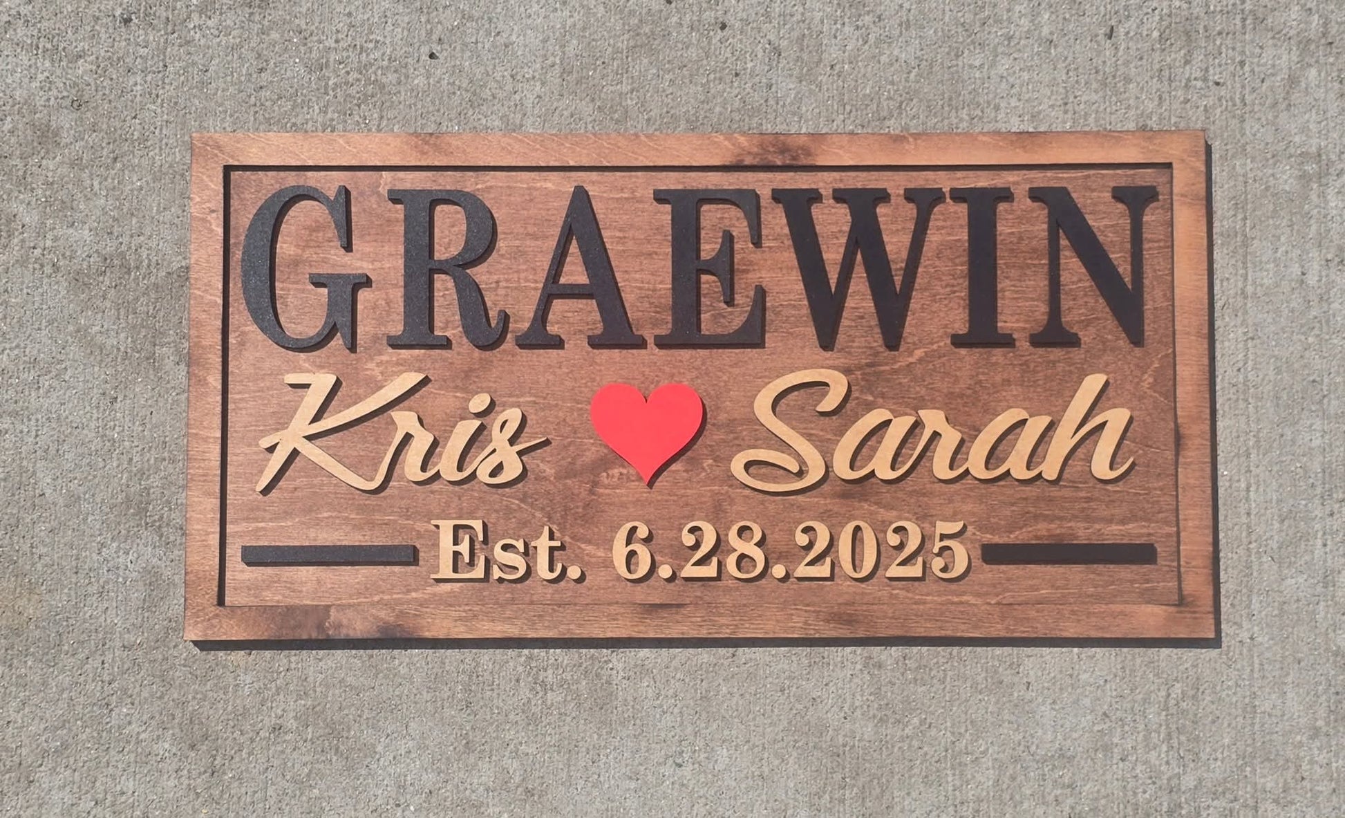 Wood is stained and burned, heart is painted red. Can be stained like 1st names if you'd like. Please be specific what color you would like the heart.